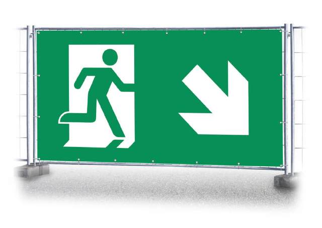 Bauzaunbanner mit Notausgangssymbol - Pfeil rechts abwärts bedruckt aus Mesh- oder Frontlitplane.