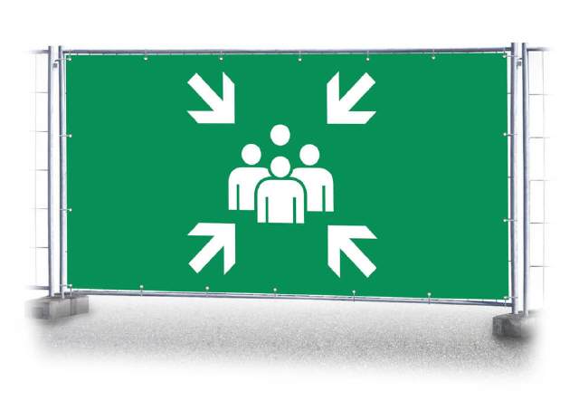 Bauzaunbanner mit Sammelpunktsymbol bedruckt aus Mesh- oder Frontlitplane.