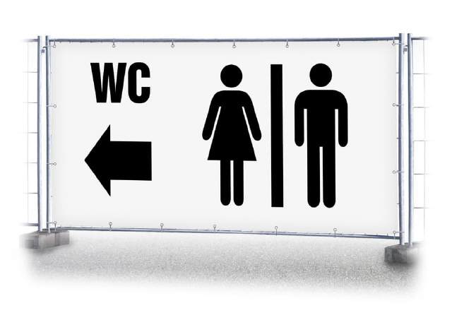 Bauzaunbanner mit WC Pfeil links bedruckt aus Mesh- oder Frontlitplane.