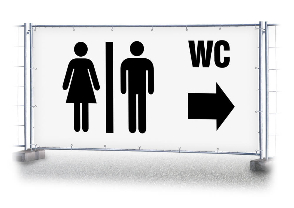 Das Bauzaunbanner ist ideal als Sichtschutz und Werbefläche für Veranstaltungen im Innen- und Außenbereich. Das Bauzaunbanner hat den Aufdruck "WC Pfeil rechts". Maß Bauzuanbanner - 340 x 173 cm. Als Mesh- oder Frontlitplane erhältlich. Bereits Kantenverstärkt und geöst.