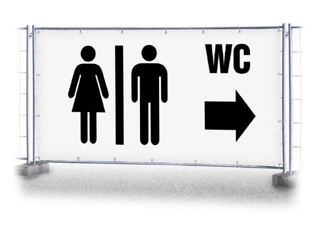 Bauzaunbanner mit WC Pfeil rechts bedruckt aus Mesh- oder Frontlitplane.