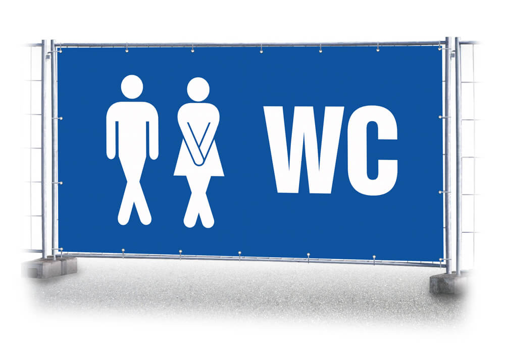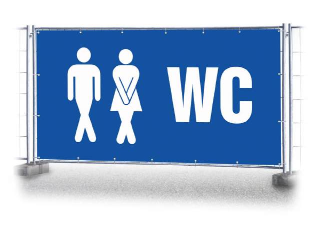 Das Bauzaunbanner ist ideal als Sichtschutz und Werbefläche für Veranstaltungen im Innen- und Außenbereich. Das Bauzaunbanner hat den Aufdruck "WC". Maß Bauzuanbanner - 340 x 173 cm. Als Mesh- oder Frontlitplane erhältlich. Bereits Kantenverstärkt und geöst.